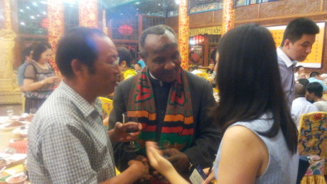 8月2日晚,我公司銘澤機械董事長李新生與各位代表在王爺府--白家大院歡迎贊比亞共和國前副總統盧潘多.姆瓦佩,宴會期間與贊比亞共和國前副總統盧潘多.姆瓦佩、杰出華商協會主席盧俊卿、執行主席韓薇進行親切交談。